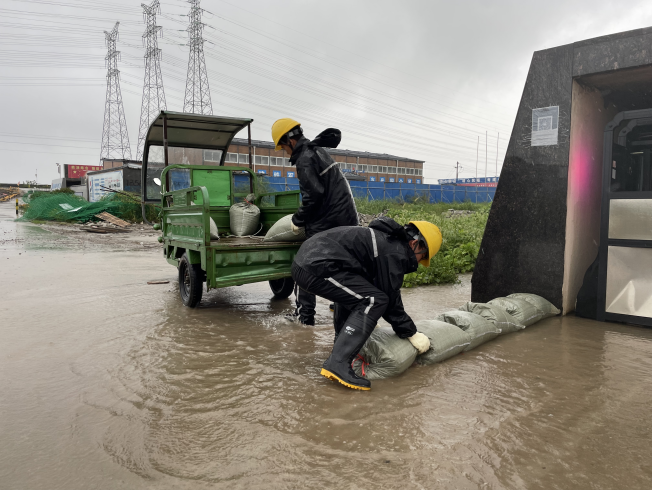 太阳能公司华东区镇海电站运维人员用沙袋封堵场区关键点位