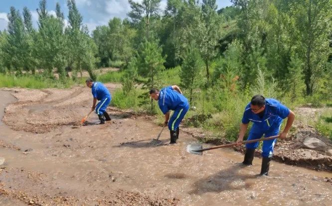 风电公司洗马林10万千瓦风电场运维人员对存在积水积沙积石的沟道进行清理