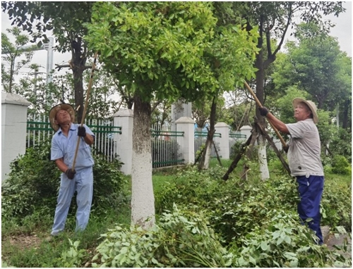 温州中环公司对全厂进行细致全面的防台风现场检查,图为对绿化带树木进行修剪,减少迎风面,增加稳定性