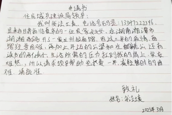 事情还得从今年3月初说起。当时,湘潭市住建局收到一封特殊的救助信。信上写道,来自甘肃的一位名叫妥法大麦的妇女在湘潭市岳塘区湖湘西路开了一家餐饮店,因三年疫情导致经营困难,再加上家中上有老下有小,丈夫重病,生活难以为继,希望能减免一年水费,暂缓生活压力。