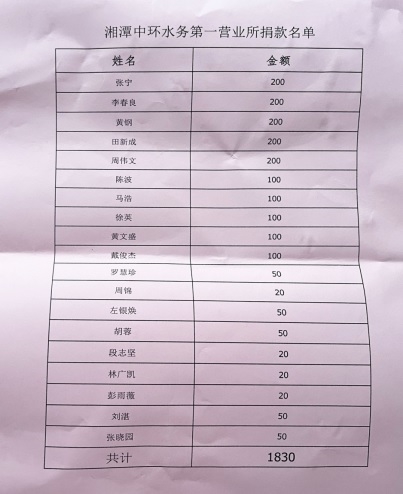 收到信后,湘潭中环党委高度重视,工作人员立即来到妥法大麦家中询问具体情况。在查看核实相关资料之后,一营业所全体党员自发进行募捐,仅一天时间就募捐到1830元,基本解决了妥法大麦一年的水费问题,有效地缓解了用户遇到的暂时困难。“全国人民一家亲。”当天,妥法大麦感激的心情久久不能平静。
